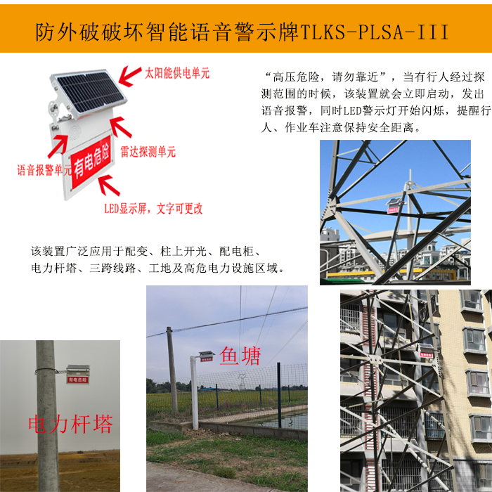 TLKS-PLSA-III線路防外力破壞智能警示牌廣泛適用于配變、柱上開關(guān)、配電柜、電力桿塔、三跨線路、工地及高危電力設(shè)施區(qū)域,為這些關(guān)鍵區(qū)域提供強(qiáng)有力的安全保障。