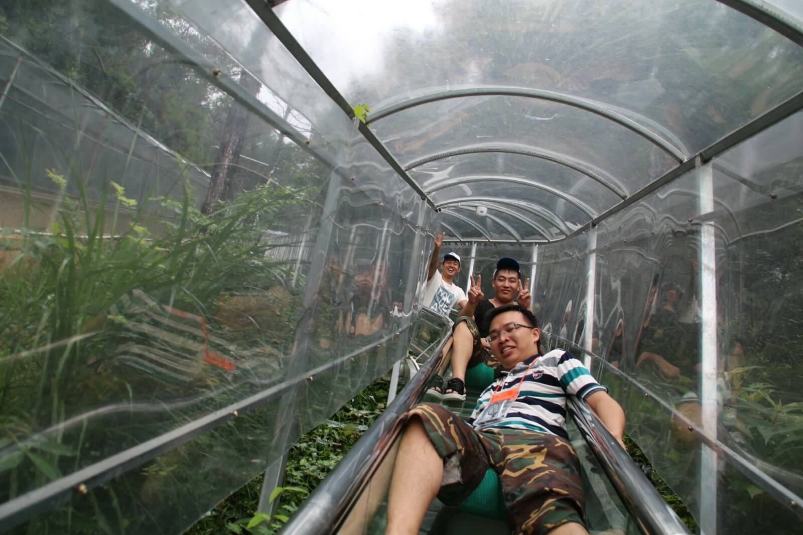 大約經(jīng)過半小時(shí)的登山,便抵達(dá)了驚魂玻璃橋及與之相依的飛龍滑道,驚魂玻璃橋的空中廊橋全長(zhǎng)接近200米,懸空離地180米左右,對(duì)于有恐高癥的人來說,不畏是一處挑戰(zhàn)自我的好地方。不過,再怎么害怕,再通過全長(zhǎng)達(dá)500多米的飛龍滑道到達(dá)山下之后,也就不存在了,長(zhǎng)長(zhǎng)的滑道可是讓我們重新體驗(yàn)了一把童年的滑梯享受。另外,景區(qū)還設(shè)有水上樂園、空中漂流及水上拓展項(xiàng)目。