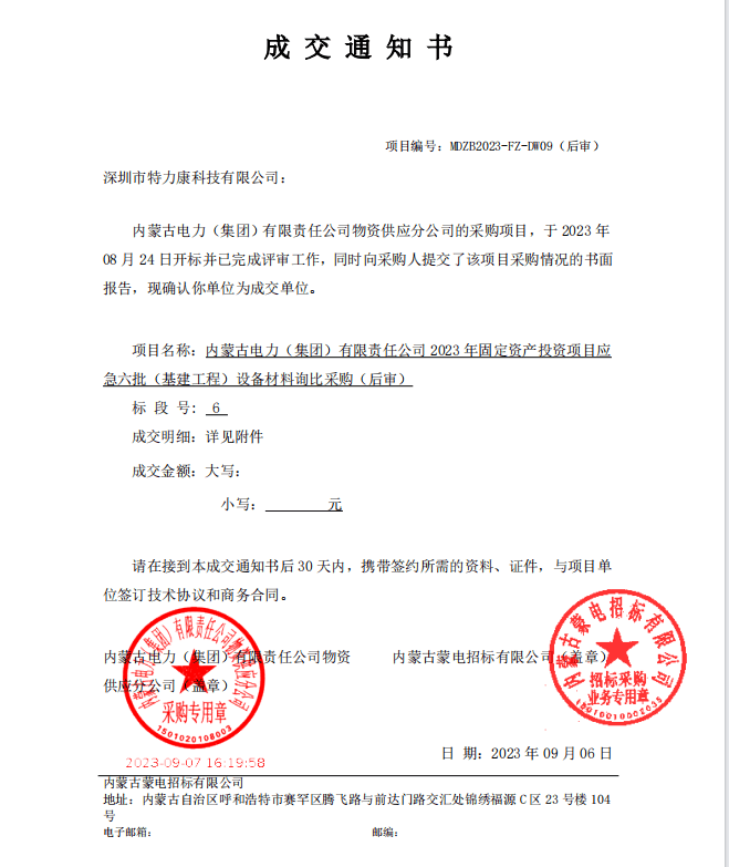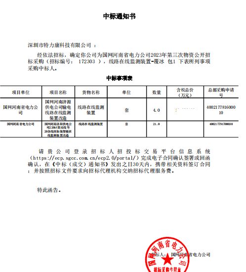 特力康中標(biāo)國(guó)網(wǎng)黑龍江送變電工程公司的2024年度第18次物資類競(jìng)爭(zhēng)性談判采購(gòu)項(xiàng)目——慶陽(yáng)驅(qū)鳥(niǎo)器物資框 特力康中標(biāo)國(guó)網(wǎng)甘肅省電力公司省管產(chǎn)業(yè)單位2024年第五次物資競(jìng)爭(zhēng)性談判授權(quán)采購(gòu)項(xiàng)目 中標(biāo)喜訊:深圳市特力康科技有限公司成功入圍許繼集團(tuán)綜合能源公司輸電線路視頻在線監(jiān)測(cè)裝置模塊集采項(xiàng)目 中標(biāo)喜訊:特力康成功中標(biāo)國(guó)網(wǎng)重慶市電力公司渝中一片區(qū)項(xiàng)目 特力康成功中標(biāo)國(guó)網(wǎng)天津市電力公司2024年第二次?物?資招標(biāo)項(xiàng)目 特力康中標(biāo)國(guó)網(wǎng)安徽省電力有限公司蕪湖供電公司2024年3月非物質(zhì)采購(gòu)項(xiàng)目 四川電力用特力康架空輸電線路山火監(jiān)測(cè)裝置,筑牢林區(qū)輸電 “防火墻”? 遼寧電力啟用特力康多視角監(jiān)拍裝置,全維度守護(hù)輸電安全? 破解黃土高原沉降難題:山西電力用特力康北斗裝置守桿塔安全? 山東電力啟用特力康動(dòng)態(tài)版智能激光驅(qū)鳥(niǎo)器,動(dòng)態(tài)防控守護(hù)變電站安全? 湖南超高壓電力啟用特力康球機(jī) AI 監(jiān)測(cè)裝置,智能守護(hù)輸電通道安全? 廣西電力啟用特力康高壓電纜護(hù)層環(huán)流監(jiān)控設(shè)備,筑牢電纜安全防線? 山東電力用上特力康綜合驅(qū)鳥(niǎo)器,多手段守護(hù)變電站安全? 陜西電力啟用特力康智能預(yù)警系統(tǒng),多維監(jiān)測(cè)守護(hù)輸電安全? 寧夏配電線路安裝了我司防外破電子化智能警示牌