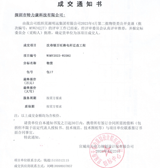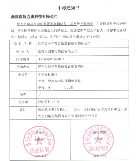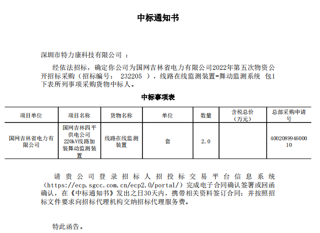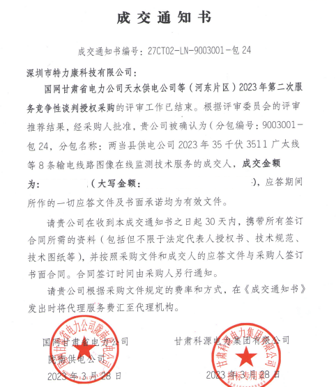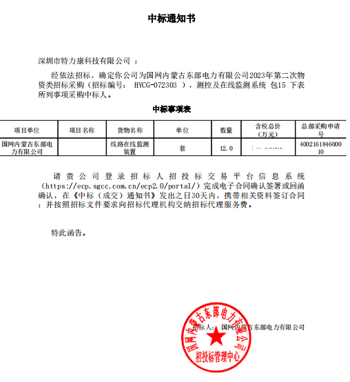 特力康中標(biāo)國網(wǎng)黑龍江送變電工程公司的2024年度第18次物資類競爭性談判采購項目——慶陽驅(qū)鳥器物資框 特力康中標(biāo)國網(wǎng)甘肅省電力公司省管產(chǎn)業(yè)單位2024年第五次物資競爭性談判授權(quán)采購項目 中標(biāo)喜訊:深圳市特力康科技有限公司成功入圍許繼集團(tuán)綜合能源公司輸電線路視頻在線監(jiān)測裝置模塊集采項目 中標(biāo)喜訊:特力康成功中標(biāo)國網(wǎng)重慶市電力公司渝中一片區(qū)項目 特力康成功中標(biāo)國網(wǎng)天津市電力公司2024年第二次?物?資招標(biāo)項目 特力康中標(biāo)國網(wǎng)安徽省電力有限公司蕪湖供電公司2024年3月非物質(zhì)采購項目 四川電力用特力康架空輸電線路山火監(jiān)測裝置,筑牢林區(qū)輸電 “防火墻”? 遼寧電力啟用特力康多視角監(jiān)拍裝置,全維度守護(hù)輸電安全? 破解黃土高原沉降難題:山西電力用特力康北斗裝置守桿塔安全? 山東電力啟用特力康動態(tài)版智能激光驅(qū)鳥器,動態(tài)防控守護(hù)變電站安全? 湖南超高壓電力啟用特力康球機(jī) AI 監(jiān)測裝置,智能守護(hù)輸電通道安全? 廣西電力啟用特力康高壓電纜護(hù)層環(huán)流監(jiān)控設(shè)備,筑牢電纜安全防線? 山東電力用上特力康綜合驅(qū)鳥器,多手段守護(hù)變電站安全? 陜西電力啟用特力康智能預(yù)警系統(tǒng),多維監(jiān)測守護(hù)輸電安全? 寧夏配電線路安裝了我司防外破電子化智能警示牌