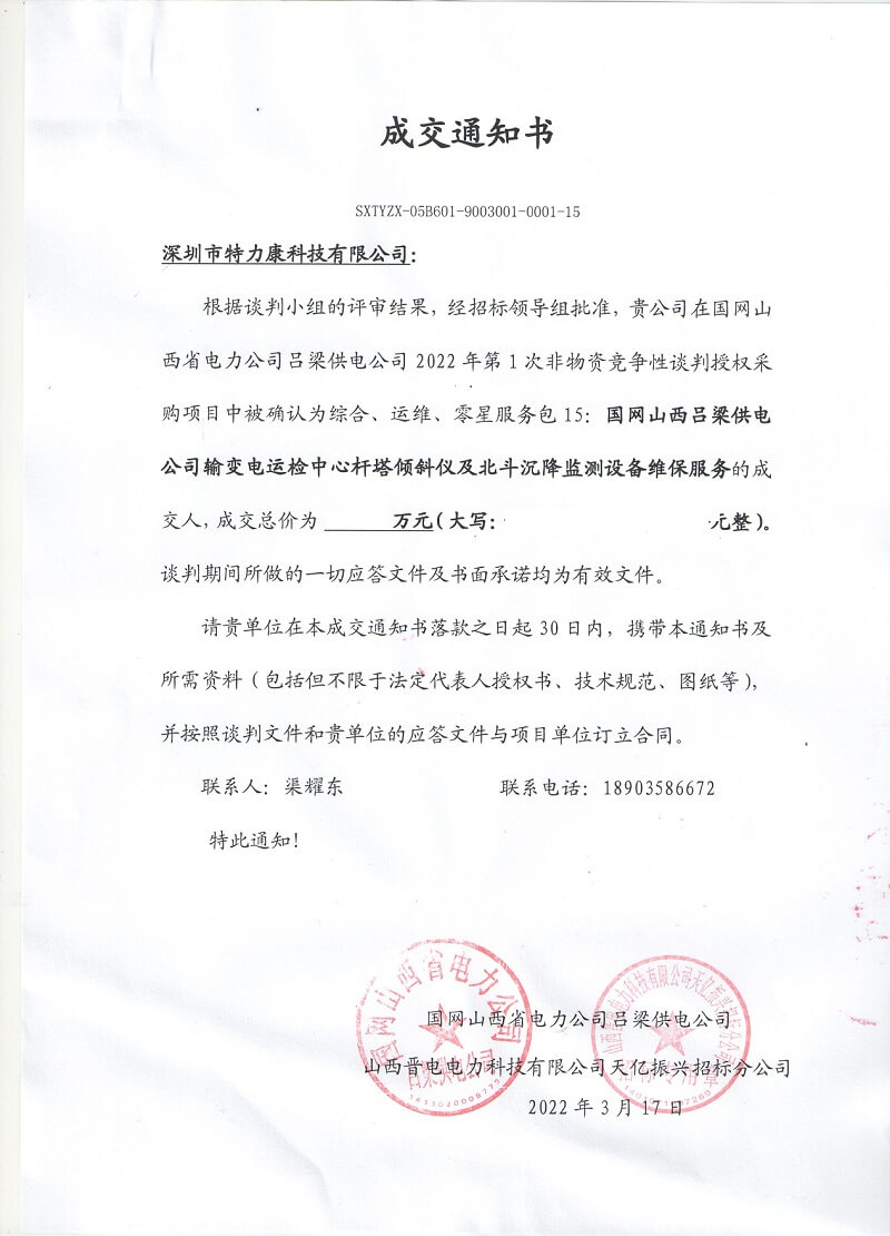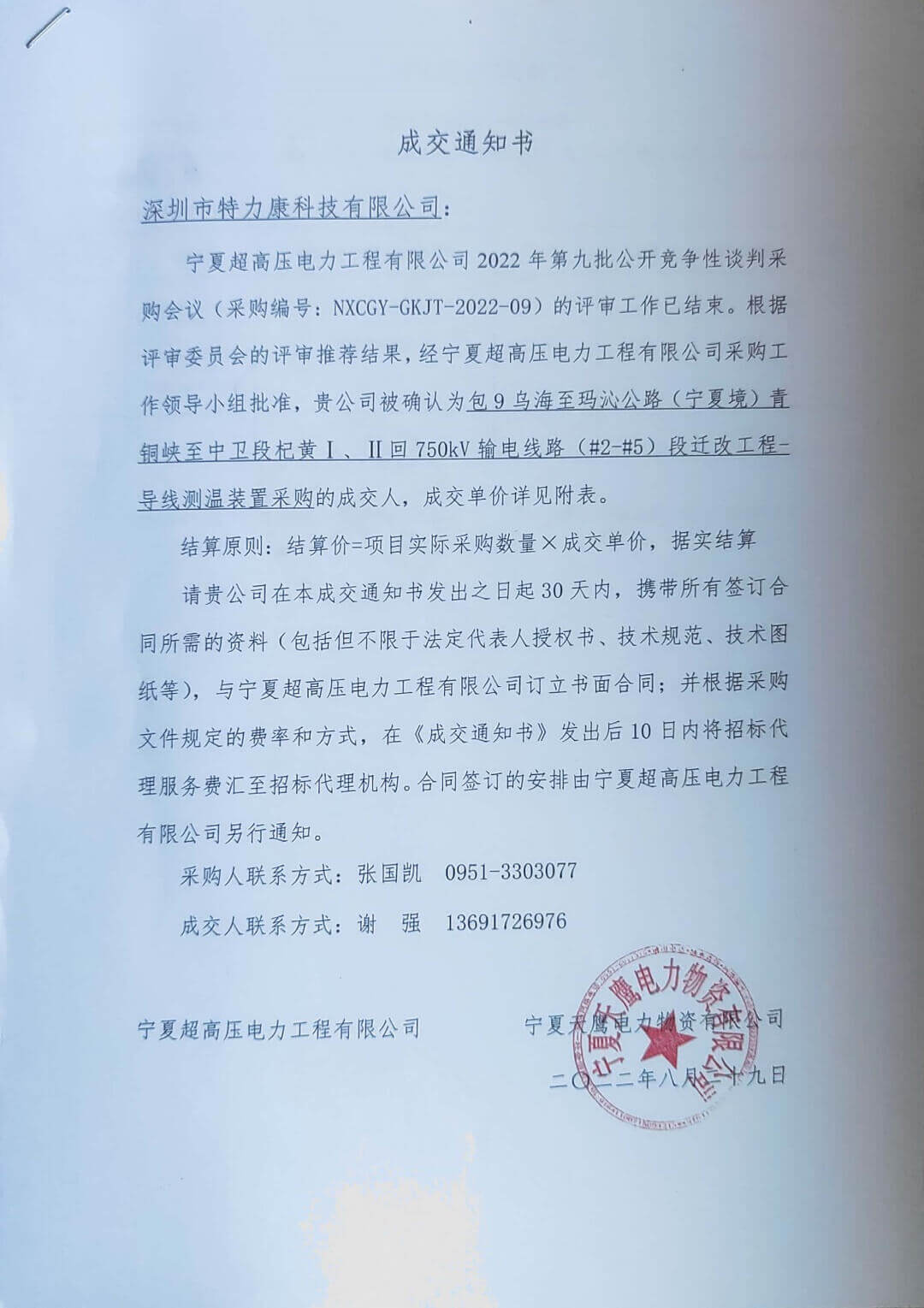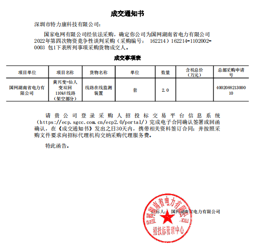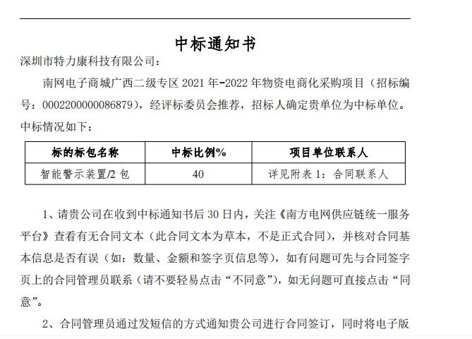 特力康中標(biāo)國(guó)網(wǎng)黑龍江送變電工程公司的2024年度第18次物資類競(jìng)爭(zhēng)性談判采購(gòu)項(xiàng)目——慶陽(yáng)驅(qū)鳥器物資框 特力康中標(biāo)國(guó)網(wǎng)甘肅省電力公司省管產(chǎn)業(yè)單位2024年第五次物資競(jìng)爭(zhēng)性談判授權(quán)采購(gòu)項(xiàng)目 中標(biāo)喜訊:深圳市特力康科技有限公司成功入圍許繼集團(tuán)綜合能源公司輸電線路視頻在線監(jiān)測(cè)裝置模塊集采項(xiàng)目 中標(biāo)喜訊:特力康成功中標(biāo)國(guó)網(wǎng)重慶市電力公司渝中一片區(qū)項(xiàng)目 特力康成功中標(biāo)國(guó)網(wǎng)天津市電力公司2024年第二次?物?資招標(biāo)項(xiàng)目 特力康中標(biāo)國(guó)網(wǎng)安徽省電力有限公司蕪湖供電公司2024年3月非物質(zhì)采購(gòu)項(xiàng)目 四川電力用特力康架空輸電線路山火監(jiān)測(cè)裝置,筑牢林區(qū)輸電 “防火墻”? 遼寧電力啟用特力康多視角監(jiān)拍裝置,全維度守護(hù)輸電安全? 破解黃土高原沉降難題:山西電力用特力康北斗裝置守桿塔安全? 山東電力啟用特力康動(dòng)態(tài)版智能激光驅(qū)鳥器,動(dòng)態(tài)防控守護(hù)變電站安全? 湖南超高壓電力啟用特力康球機(jī) AI 監(jiān)測(cè)裝置,智能守護(hù)輸電通道安全? 廣西電力啟用特力康高壓電纜護(hù)層環(huán)流監(jiān)控設(shè)備,筑牢電纜安全防線? 山東電力用上特力康綜合驅(qū)鳥器,多手段守護(hù)變電站安全? 陜西電力啟用特力康智能預(yù)警系統(tǒng),多維監(jiān)測(cè)守護(hù)輸電安全? 寧夏配電線路安裝了我司防外破電子化智能警示牌