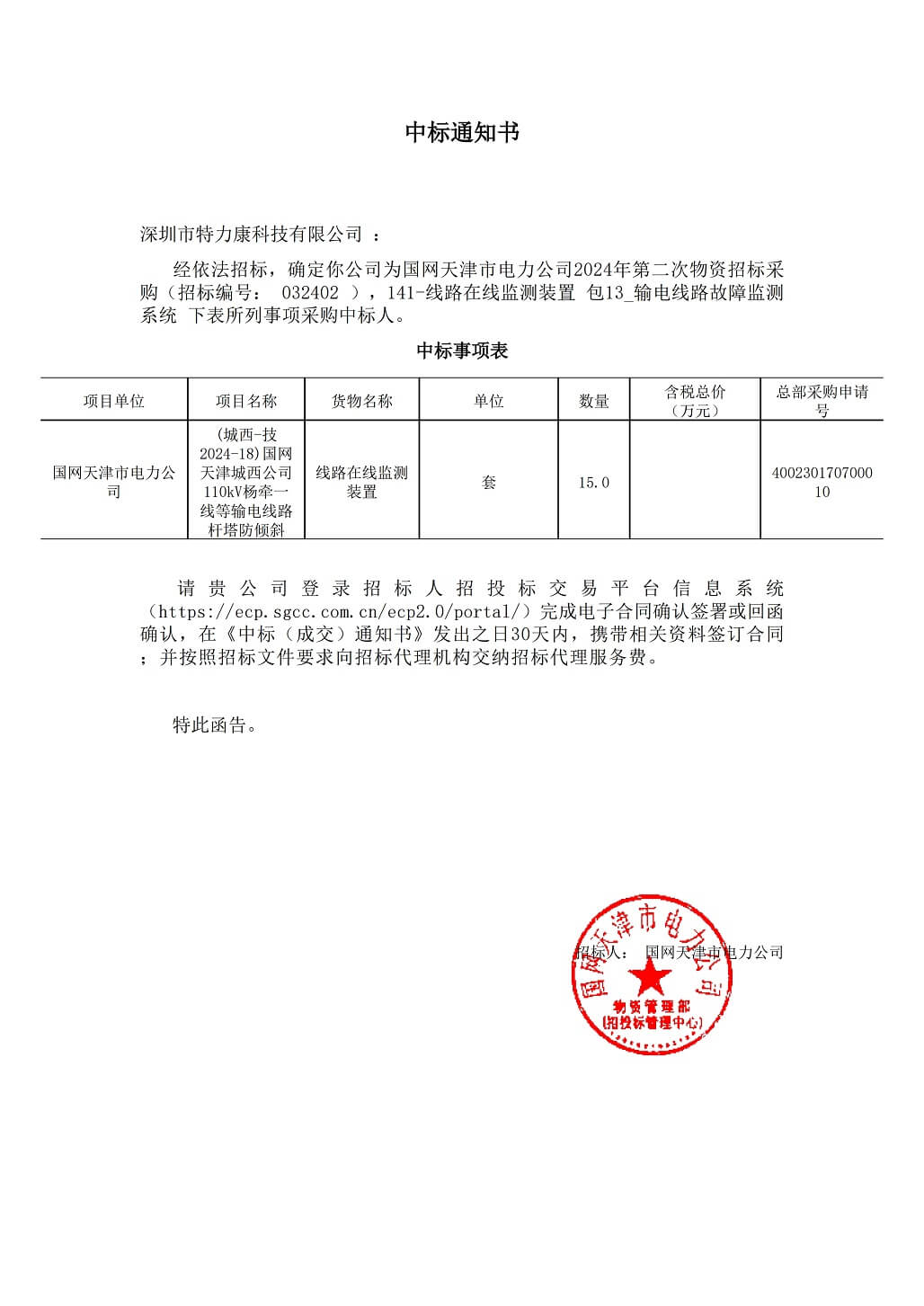 特力康中標(biāo)國網(wǎng)黑龍江送變電工程公司的2024年度第18次物資類競爭性談判采購項(xiàng)目——慶陽驅(qū)鳥器物資框 特力康中標(biāo)國網(wǎng)甘肅省電力公司省管產(chǎn)業(yè)單位2024年第五次物資競爭性談判授權(quán)采購項(xiàng)目 中標(biāo)喜訊:深圳市特力康科技有限公司成功入圍許繼集團(tuán)綜合能源公司輸電線路視頻在線監(jiān)測裝置模塊集采項(xiàng)目 中標(biāo)喜訊:特力康成功中標(biāo)國網(wǎng)重慶市電力公司渝中一片區(qū)項(xiàng)目 特力康成功中標(biāo)國網(wǎng)天津市電力公司2024年第二次?物?資招標(biāo)項(xiàng)目 特力康中標(biāo)國網(wǎng)安徽省電力有限公司蕪湖供電公司2024年3月非物質(zhì)采購項(xiàng)目 四川電力用特力康架空輸電線路山火監(jiān)測裝置,筑牢林區(qū)輸電 “防火墻”? 遼寧電力啟用特力康多視角監(jiān)拍裝置,全維度守護(hù)輸電安全? 破解黃土高原沉降難題:山西電力用特力康北斗裝置守桿塔安全? 山東電力啟用特力康動態(tài)版智能激光驅(qū)鳥器,動態(tài)防控守護(hù)變電站安全? 湖南超高壓電力啟用特力康球機(jī) AI 監(jiān)測裝置,智能守護(hù)輸電通道安全? 廣西電力啟用特力康高壓電纜護(hù)層環(huán)流監(jiān)控設(shè)備,筑牢電纜安全防線? 山東電力用上特力康綜合驅(qū)鳥器,多手段守護(hù)變電站安全? 陜西電力啟用特力康智能預(yù)警系統(tǒng),多維監(jiān)測守護(hù)輸電安全? 寧夏配電線路安裝了我司防外破電子化智能警示牌