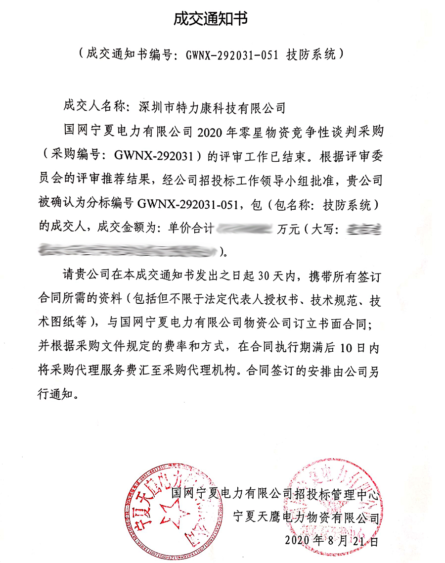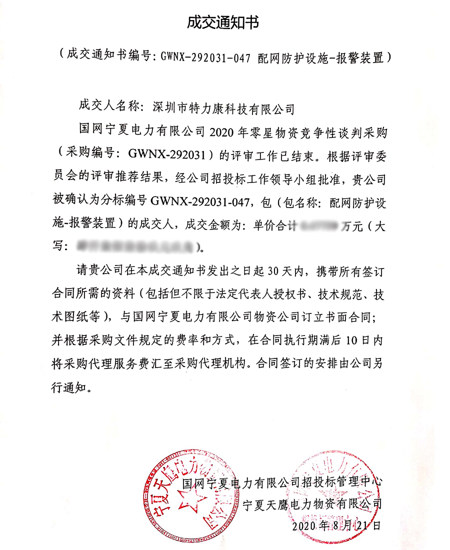 國網(wǎng)寧夏電力有限公司2020年零星物資競爭性談判采購(采購編號: GWNX-292031)的評審工作已結(jié)束。根據(jù)評審委員會的評審?fù)扑]結(jié)果,經(jīng)招投標(biāo)工作領(lǐng)導(dǎo)小組批準(zhǔn),我司(深圳市特力康科技有限公司)被確認(rèn)為分標(biāo)編號GWNX-292031-047,包(包名稱:配網(wǎng)防護(hù)設(shè)施-報警裝置)及分標(biāo)編號GWNX-292031-051,包(包名稱:技防系統(tǒng))的成交人,現(xiàn)發(fā)布成交通知書如下: