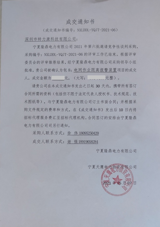 寧夏隆鼎電力有限公司2021年第六批邀請(qǐng)競(jìng)爭(zhēng)性談判采購(gòu),采購(gòu)編號(hào): NXLDDL-YQJT -2021-06的評(píng)審工作已結(jié)束。根據(jù)評(píng)審委員會(huì)的評(píng)審?fù)扑]結(jié)果,經(jīng)寧夏隆鼎電力有限公司采購(gòu)領(lǐng)導(dǎo)小組批準(zhǔn),我司被確認(rèn)為包8:電網(wǎng)作業(yè)限高報(bào)警裝置項(xiàng)目的成交人,中標(biāo)通知如下: