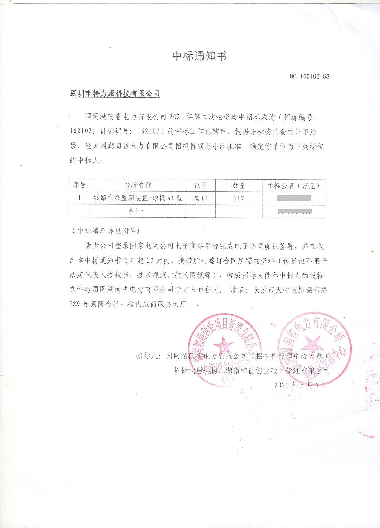國網(wǎng)湖南省電力有限公司2021年第二次物資集中招標(biāo)采購(招標(biāo)編號(hào):162102;計(jì)劃編號(hào): 162102) 的評(píng)標(biāo)工作已結(jié)束,根據(jù)評(píng)標(biāo)委員會(huì)的評(píng)審結(jié)果,經(jīng)國網(wǎng)湖南省電力有限公司招投標(biāo)領(lǐng)導(dǎo)小組批準(zhǔn),確定我司為線路在線監(jiān)測裝置-球機(jī)AI型標(biāo)包的中標(biāo)人,中標(biāo)通知如下: