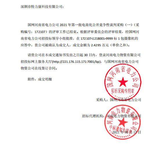 國(guó)網(wǎng)河南省電力公司2021年第一批電商化公開競(jìng)爭(zhēng)性談判采購(gòu)《- -) (果購(gòu)編號(hào): 172107) 的評(píng)審工作已結(jié)束。根據(jù)評(píng)審委員合的評(píng)審結(jié)果,經(jīng)國(guó)網(wǎng)河南省電力公司招投標(biāo)領(lǐng)導(dǎo)小組批準(zhǔn),在7210710101.9999標(biāo)1包攝像機(jī)的應(yīng)答中,責(zé)公司被確認(rèn)為成交人,中標(biāo)通知如下: