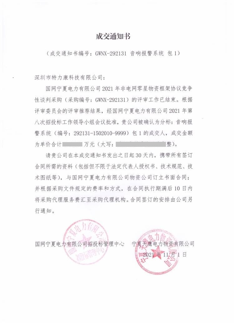 國網(wǎng)寧夏電力有限公司2021年非電網(wǎng)零星物資框架協(xié)議競爭性談判采購(采購編號: GWNX- 292131)的評審工作已結(jié)束。根據(jù)評審委員會的評審?fù)扑]結(jié)果,經(jīng)國網(wǎng)寧夏電力有限公司2021年第八次招投標(biāo)工作領(lǐng)導(dǎo)小組會議批準(zhǔn),我司被確認(rèn)為分標(biāo):音響報警系統(tǒng)(編號: 292131-1502010-9999)包1的成交人,成交通知如下: