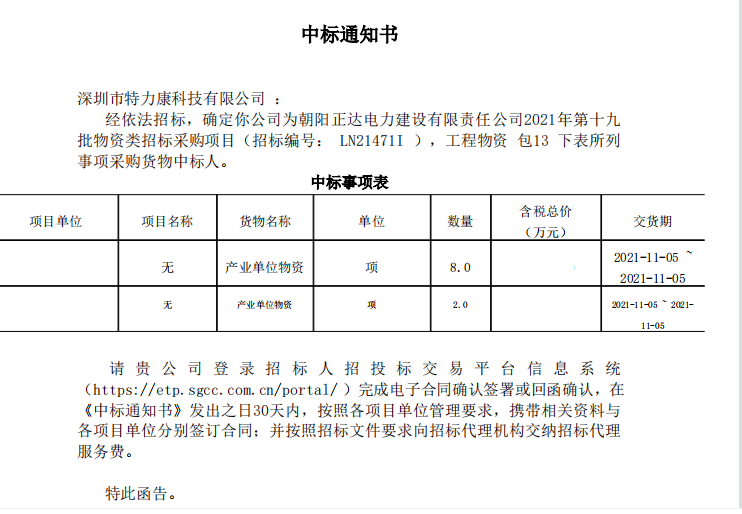 經(jīng)依法招標(biāo),確定我司為朝陽正達(dá)電力建設(shè)有限責(zé)任公司2021年第十九批物資類招標(biāo)采購項(xiàng)目(招標(biāo)編號: LN21471I )工程物資包,中標(biāo)通知如下:
