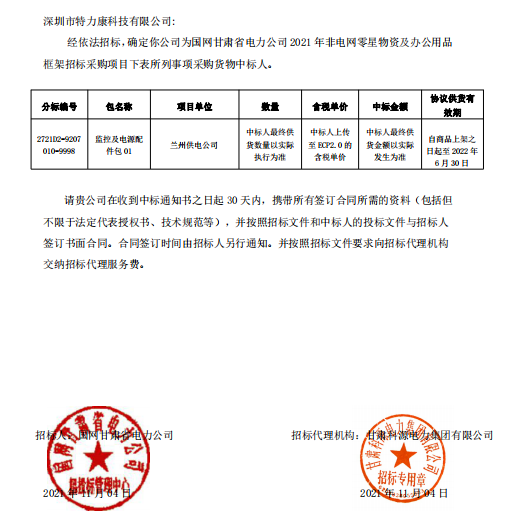 經(jīng)依法招標(biāo)。確定我司為國(guó)網(wǎng)甘肅省電力公司2021年+電網(wǎng)零星物資及辦公用品框架招標(biāo)采購(gòu)項(xiàng)目下表所列事項(xiàng)采購(gòu)貸物中標(biāo)人。中標(biāo)通知如下: