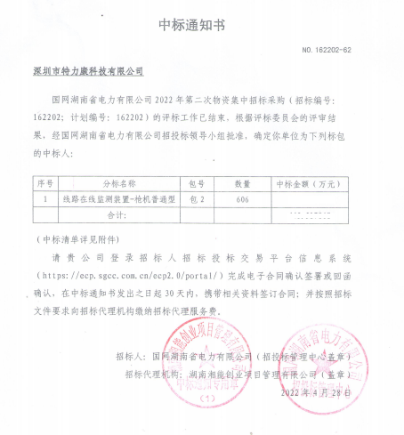 國網(wǎng)湖南省電力有限公司2022年第二次物資集中招標采購(招標編號:162202;計劃編號: 162202) 的評標工作已結(jié)束,根據(jù)評標委員金的評審結(jié)果。經(jīng)國網(wǎng)湖南省電力有限公司招投標領(lǐng)導小組批準。確定我單位為下列標包(線路在線監(jiān)測裝置- 槍機普通型)中標人,中標通知如下: