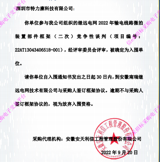 深圳市特力康科技有限公司:你單位參與我公司組織的繼遠(yuǎn)電網(wǎng)2022年輸電線路微拍裝置部件框架(二次)競爭性談判(項(xiàng)目編號:22AT13043406518- 001) ,經(jīng)評審委員會(huì)評審,被確定為入圍單位。中標(biāo)通知如下: