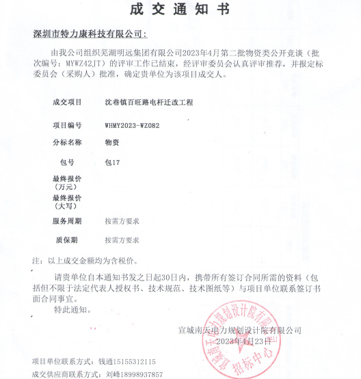 特力康中標(biāo)蕪湖明遠(yuǎn)集團(tuán)有限公司2023年4月第二批物資類公開競(jìng)談成